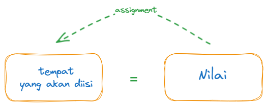 Proses pengisian atau penugasan pada variabel tersebut dengan menggunakan operator penugasan yaitu =.