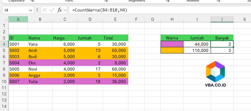 Tutup Visual Basic Editor dan rumus CountWarna sudah berhasil dibuat. Untuk penggunaan rumus ini, bisa menggunakan sintak seperti dibawah ini