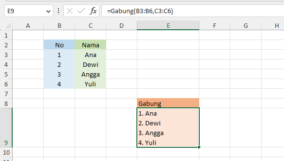 Function Gabung(RngA As Range, RngB As Range) '----------------------------------------------------- ' Sctipt VBA : 11 (Gabung Text) ' Author : https://vba.co.id ' Situs belajar VBA No.1 di Indonesia '------------------------------------------------------ If Not RngA.Count = RngB.Count Then Gabung = CVErr(xlErrRef) Exit Function End If For i = 1 To RngA.Count tmp = tmp & vbLf & RngA(i, 1) & ". " & RngB(i, 1) Next Gabung = Replace(tmp, vbLf, "", 1, 1) End Function
