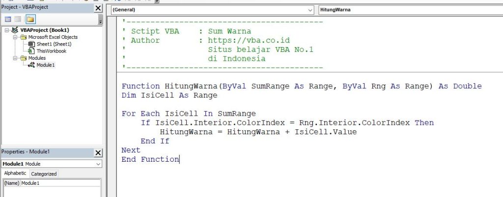 '----------------------------------------- ' Sctipt VBA : Sum Warna ' Author : https://vba.co.id ' Situs belajar VBA No.1 ' di Indonesia '----------------------------------------- Function HitungWarna(ByVal SumRange As Range, ByVal Rng As Range) As Double Dim IsiCell As Range For Each IsiCell In SumRange If IsiCell.Interior.ColorIndex = Rng.Interior.ColorIndex Then HitungWarna = HitungWarna + IsiCell.Value End If Next End Function